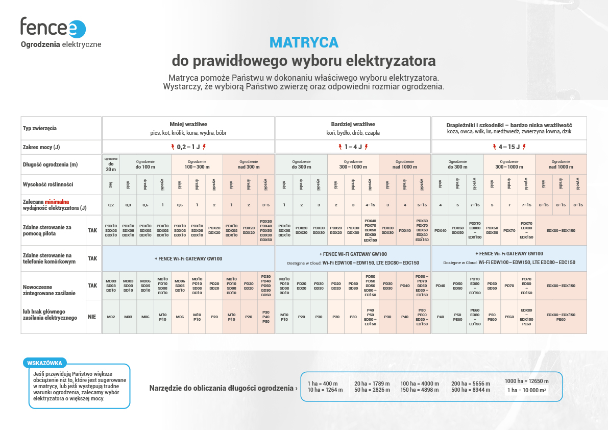Aby pomóc Ci wybrać odpowiedni elektryzator, stworzyliśmy poręczną matrycę, która uwzględnia wszystkie kluczowe czynniki. Wszystko, co musisz wiedzieć, to przybliżona długość instalacji w kilometrach lub hektarach oraz rodzaj zwierzęcia, dla którego (lub przeciwko któremu) ogrodzenie elektryczne będzie używane. Ogólnie rzecz biorąc, im dłuższy wybieg lub trudniejszy teren, tym mocniejsze zasilanie. Nie zapomnij jednak wziąć pod uwagę innych czynników, takich jak jakość uziemienia, charakterystyka przewodów, odporność zwierząt i sposób zasilania elektryzatora. Jeśli w pobliżu znajduje się gniazdo zasilania, elektryzatory sieciowe będą wystarczające. Z drugiej strony, elektryzatory uniwersalne mogą być również zasilane z sieci za pomocą standardowego akumulatora (12 V), który może być również używany jako zapasowe elektryzator zasilania w przypadku awarii zasilania.