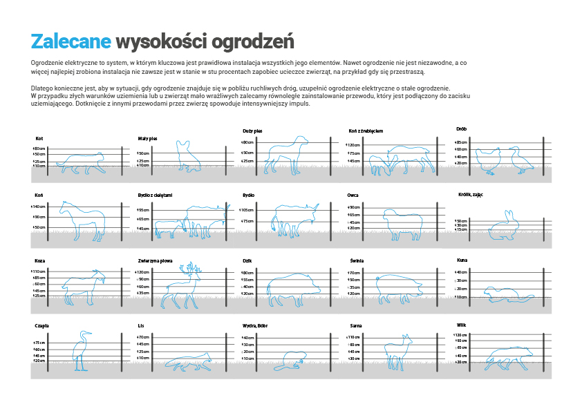 Kolejnym krokiem jest wybór odpowiedniej wysokości poszczególnych rzędów drutu. Jest to oparte na wielkości i sile zwierzęcia, które będzie przebywać w kojcu. Przy wyborze idealnej wysokości zalecamy kierowanie się poniższym schematem, który stworzyliśmy dla Ciebie. Pamiętaj jednak, że wysokość ogrodzenia elektrycznego, które zaprojektowaliśmy, jest mierzona w idealnych warunkach lub prawie bez zarośli.