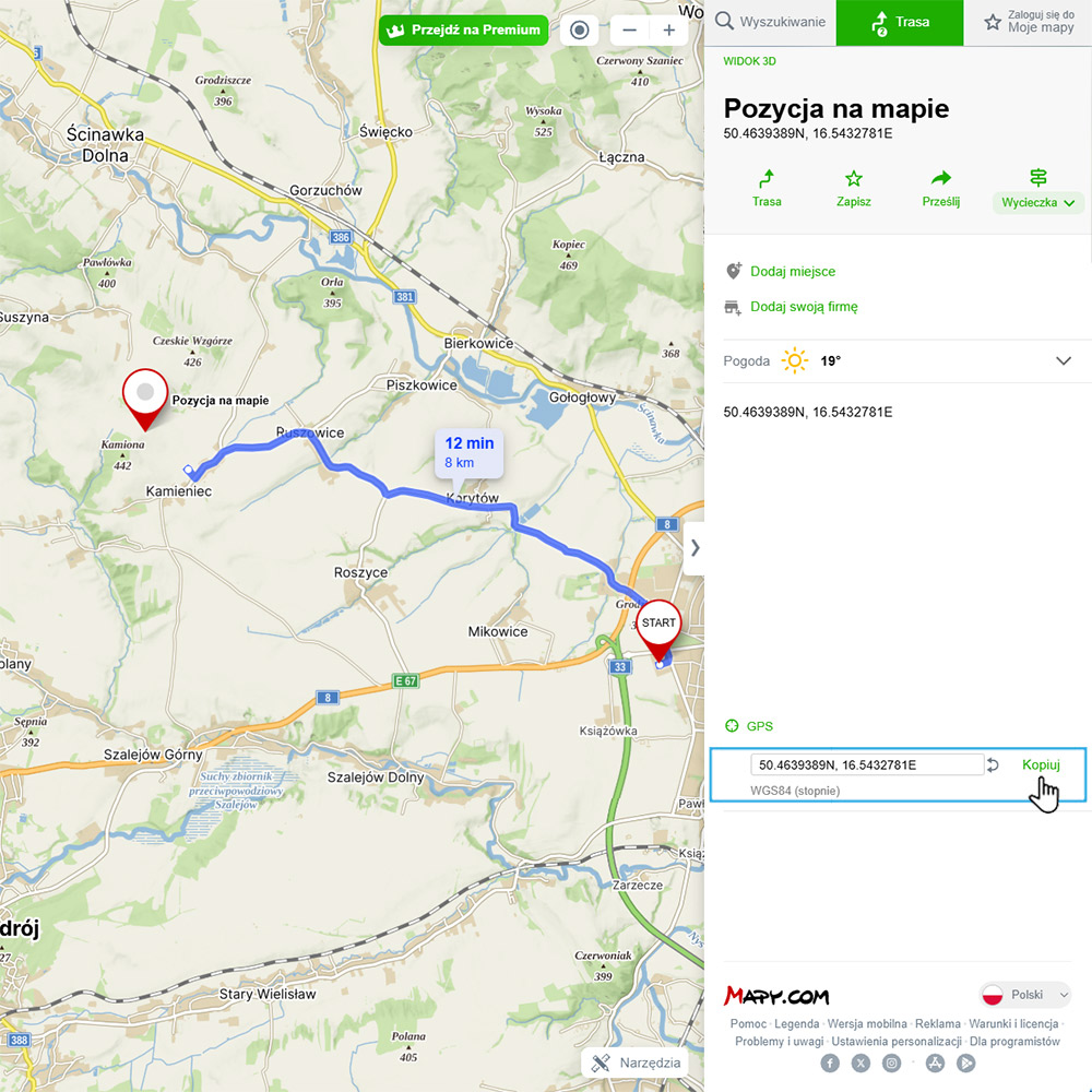- Kliknij punkt, a w panelu po prawej stronie znajdziesz współrzędne GPS
