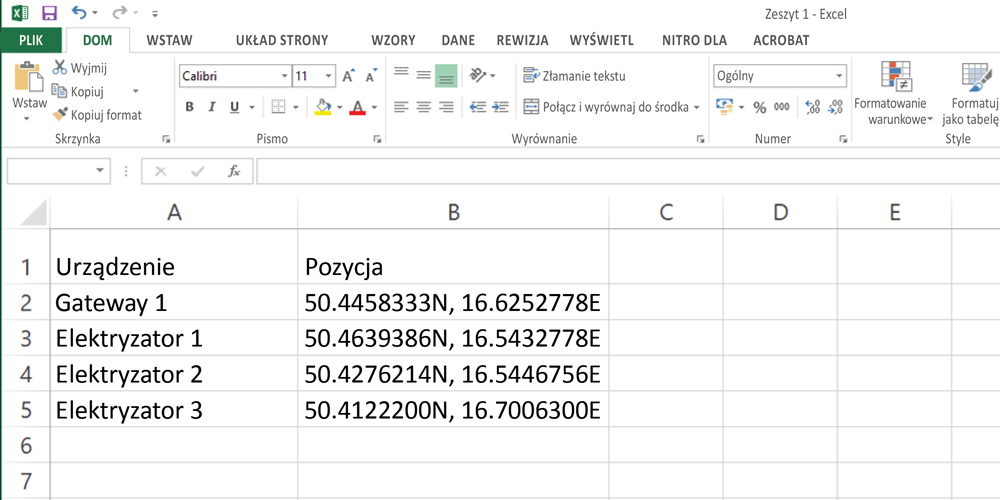 - Otwórz program Microsoft Excel i wklej do niego współrzędne, jak pokazano na poniższym przykładzie
