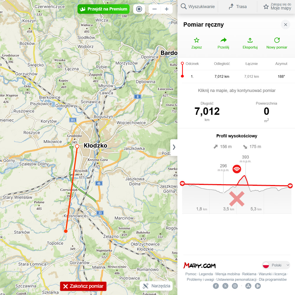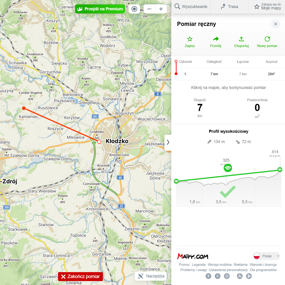 - W prawym dolnym rogu mapy kliknij "Narzędzia " - "Pomiary odległości i powierzchni".