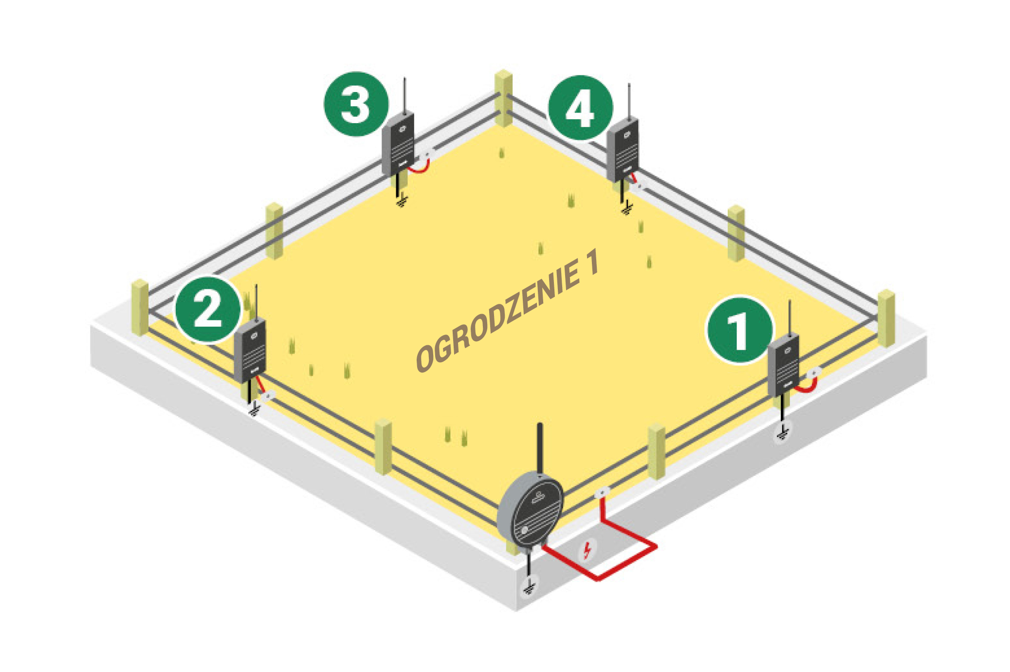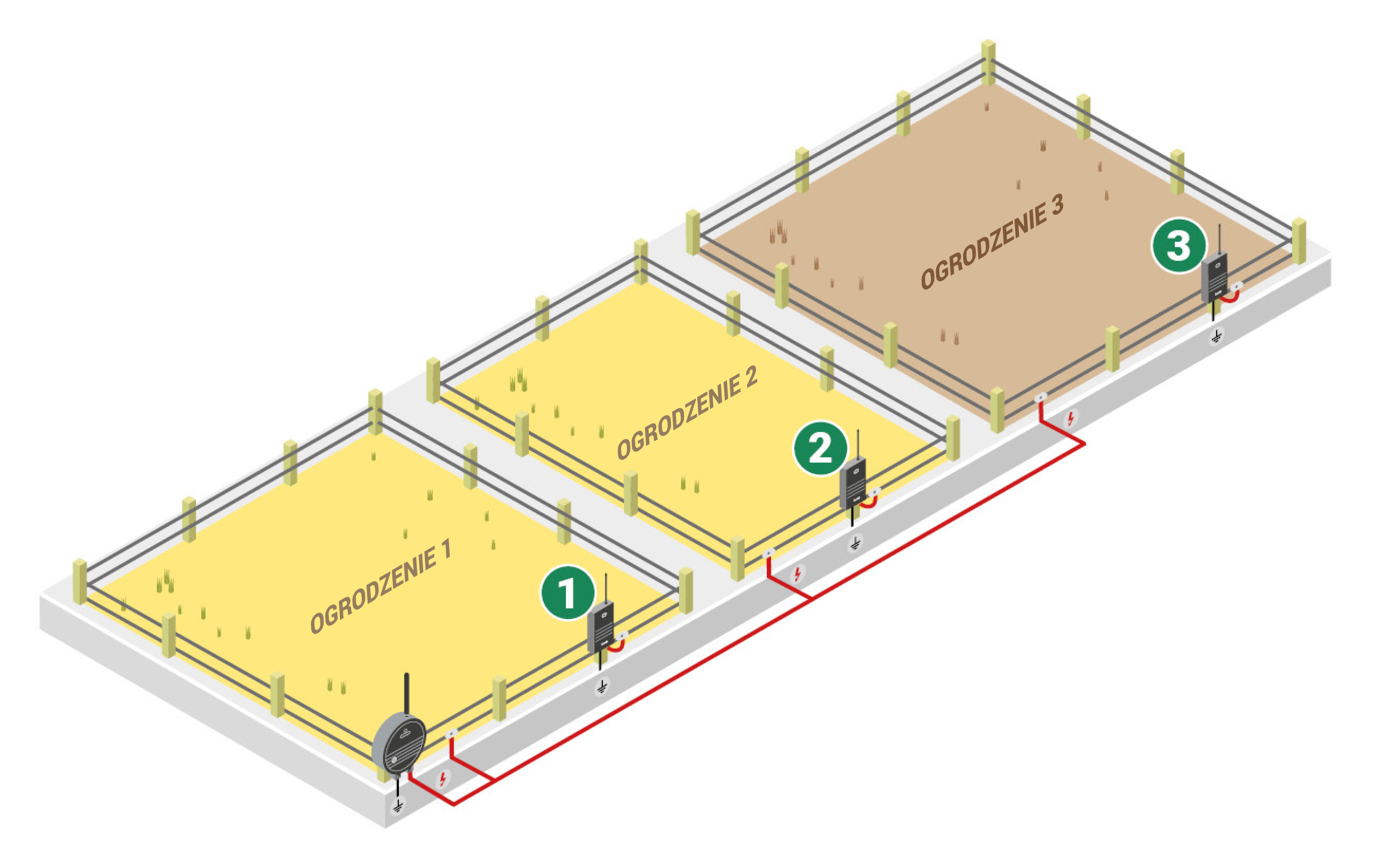 Jeśli używasz jednego elektryzatora do zasilania na przykład trzech ogrodzeń, zainstaluj monitory monitorujące przy wejściach do ogrodzeń. W ten sposób szybko dowiesz się, w którym kojcu uruchomił się alarm i nie będziesz tracić czasu na szukanie. Będziesz mieć przegląd każdego kojca.