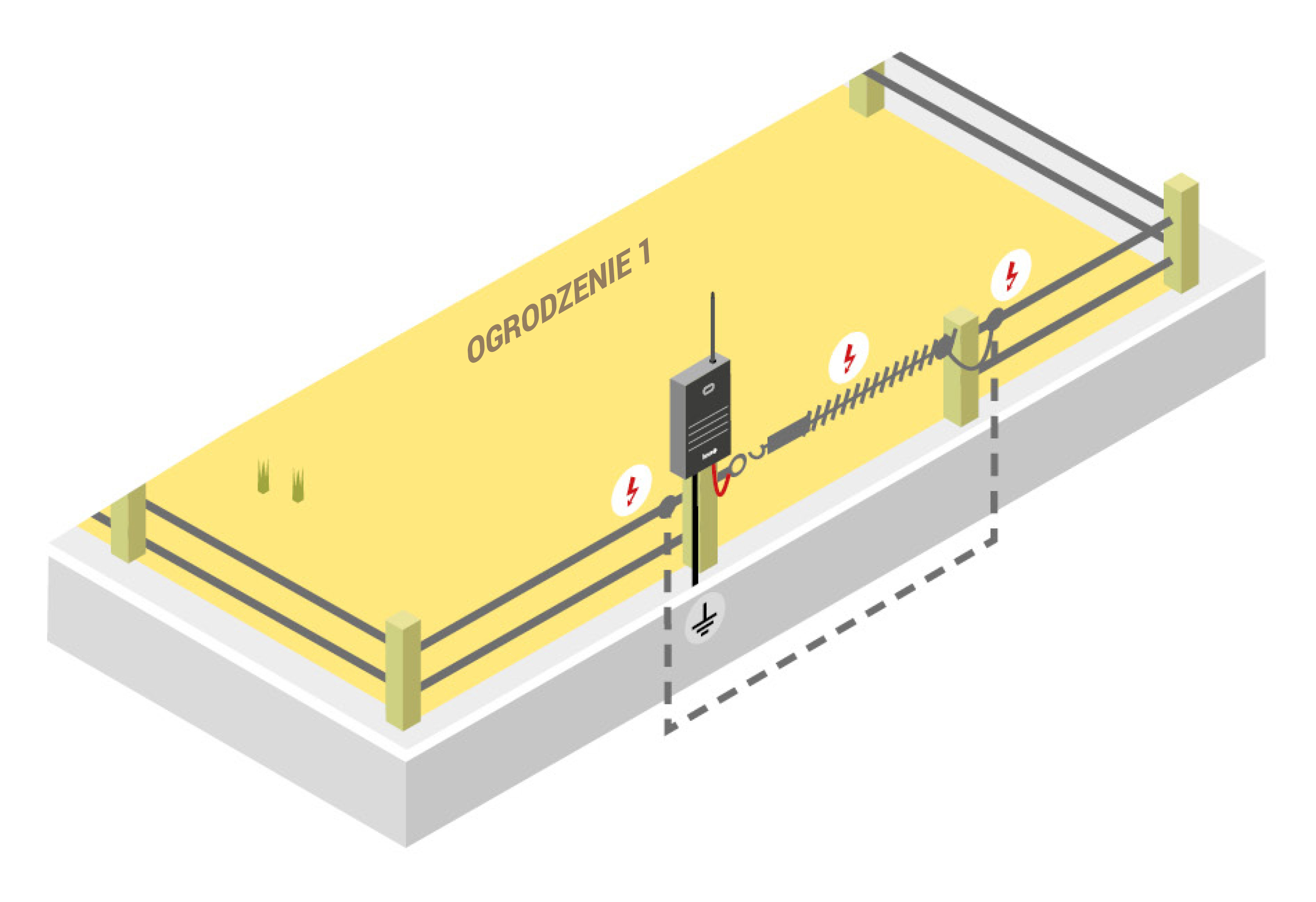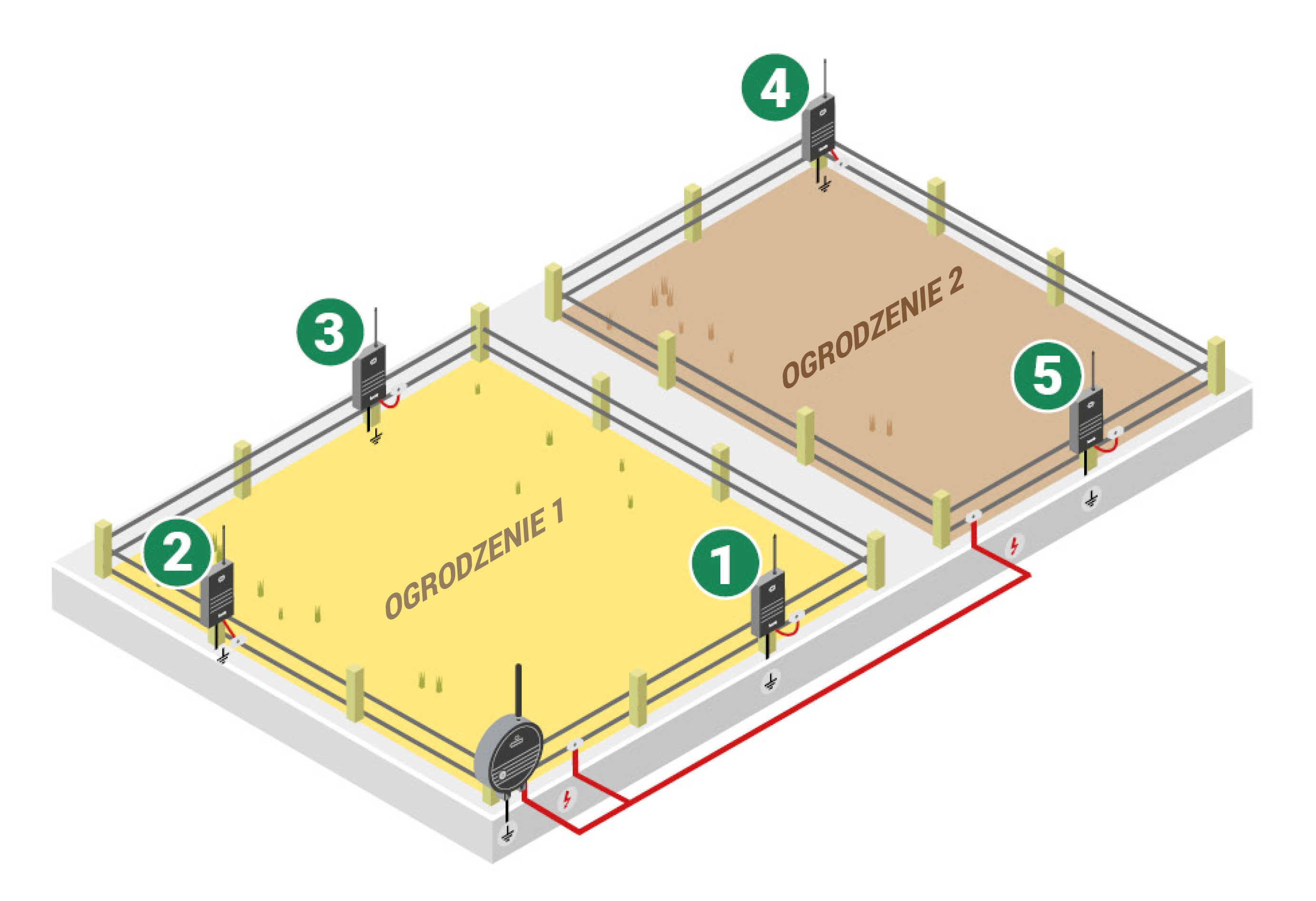 Powszechnym sposobem korzystania z urządzenia monitorującego jest zainstalowanie kilku monitorów na jednym ogrodzeniu, dzieląc w ten sposób ogrodzenie na kilka sektorów. Jest to przydatne rozwiązanie, zwłaszcza jeśli ogrodzenie jest dłuższe. Zalecamy umieszczenie monitorów w trudniej dostępnych i bardziej oddalonych miejscach. Jeśli napięcie spadnie na ogrodzeniu, określony monitor włączy alarm. Natychmiast dowiesz się, że usterka na ogrodzeniu wystąpiła w sekcji z monitorem monitorującym pod nazwą "Strażnik 2". Szybko dowiesz się, w której sekcji wystąpił problem i nie musisz przeszukiwać całego ogrodzenia . Dla każdego monitora ustawiasz wartość napięcia, dla której wyzwalany jest alarm.