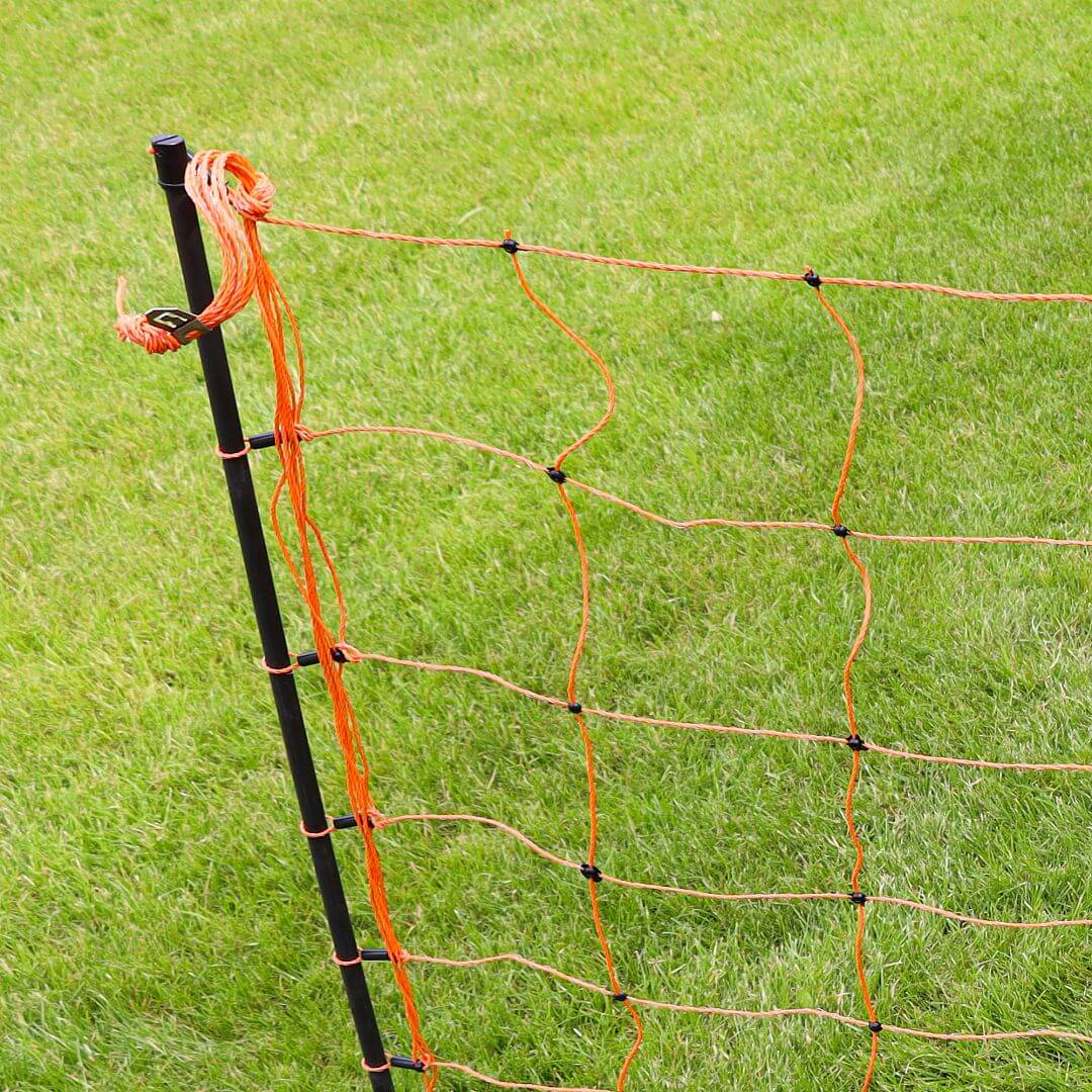 Siatka elektryczna posiada 13 słupków z dwoma kolcami dla lepszej stabilności. Przeznaczona głównie dla owiec i kóz, może być również stosowana dla świń. Standardowa długość siatki 50 m, wysokość siatki 90 cm zapobiega przeskakiwaniu. 7 poziomych linek z drutem ze stali nierdzewnej o grubości 3 × 0,20 mm + 1 dolny rząd (czarny drut) jest nieprzewodzący, izoluje. Uzupełnij siatkę ogrodzeniową o wizualną taśmę sygnalizacyjną - barierę.