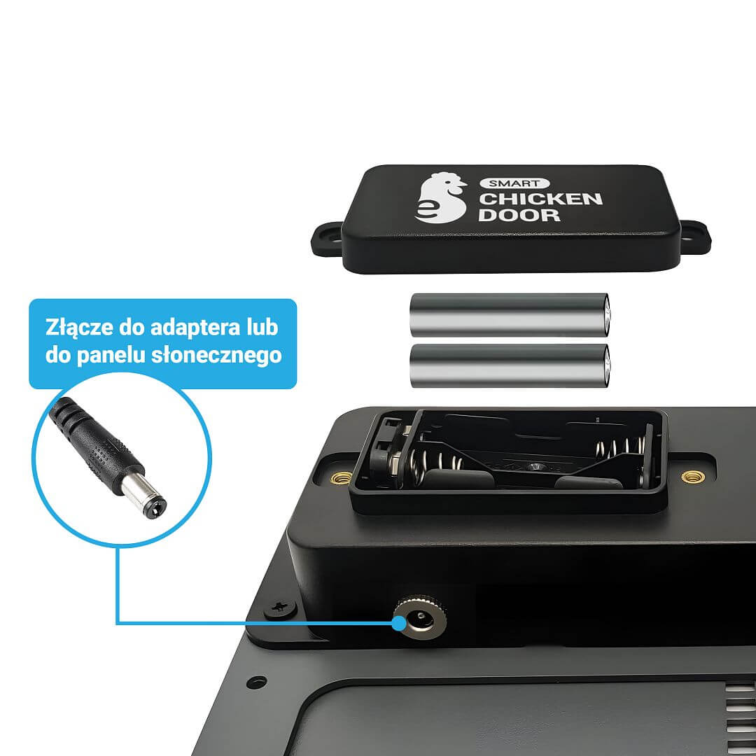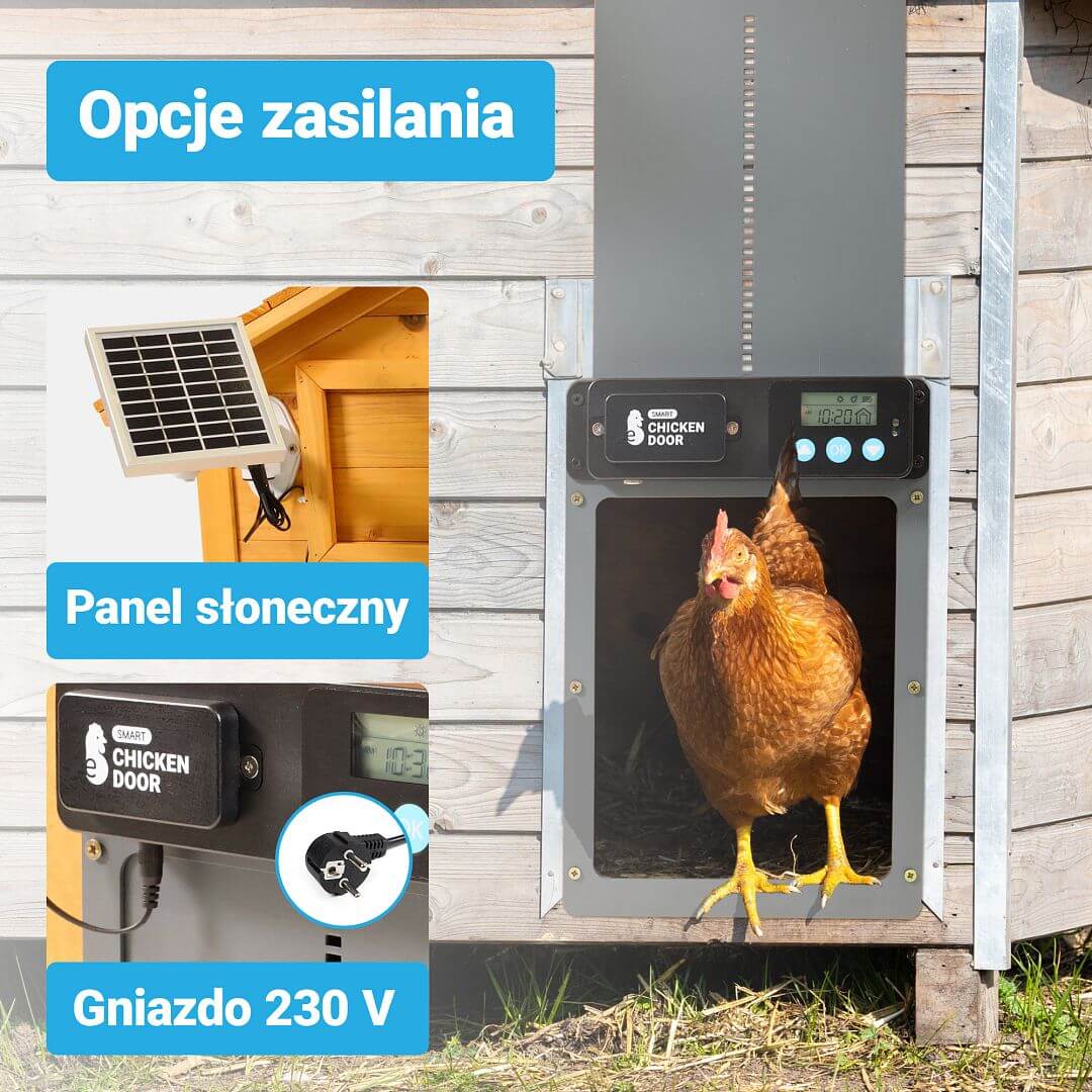 Zasilanie tej wersji automatycznych drzwi do kurnika zapewnia elektryzator 230 V. Drzwi mogą być również zasilane dwiema bateriami AA (niedołączonymi do tej wersji) lub panelem słonecznym (niedołączonym do tej wersji).