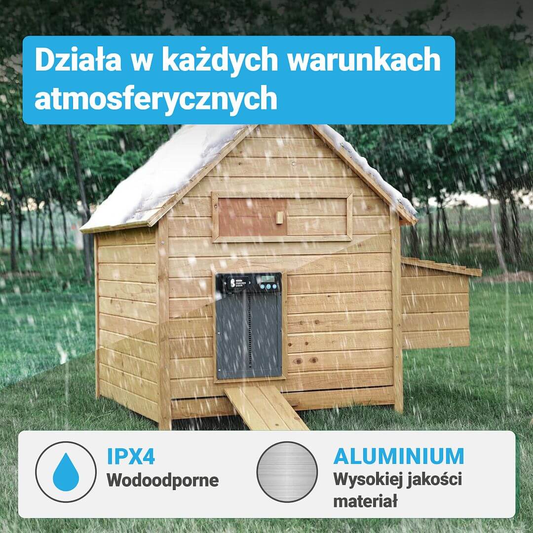 Poręczne automatyczne drzwi do kurnika z wyłącznikiem czasowym i czujnikiem światła reagującym na światło otoczenia (wyłącznik zmierzchowy). Możliwość ustawienia wielu trybów sterowania samoczynnie otwierającymi się drzwiami do kurnika. Wykonane z wytrzymałego, trwałego tworzywa sztucznego i stopu aluminium.