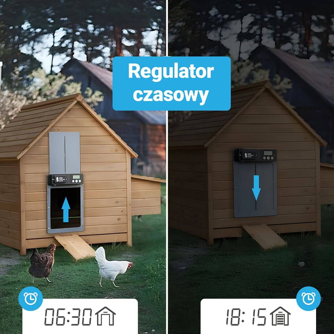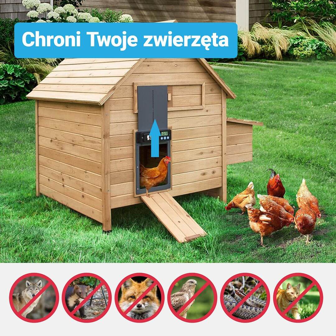 Dzięki automatycznym drzwiom będziesz mieć pewność, że drób jest zamknięty w bezpiecznym kurniku we właściwym czasie, chroniąc go przed szkodnikami.