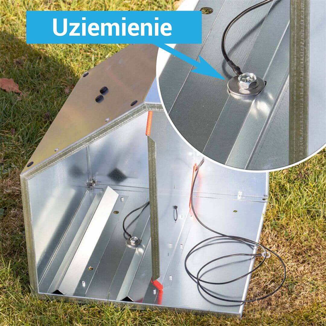 Śruba zabezpieczająca i uziemiająca przed kradzieżą przenośnej skrzynki na źródle ogrodzenia.