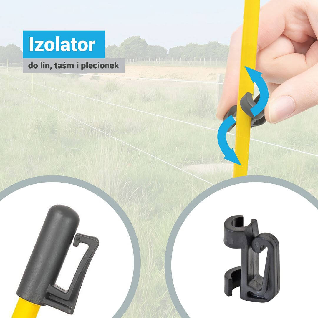 Elastyczne słupki z włókna szklanego o owalnym kształcie, w tym górny izolator głowicy + 1 dodatkowy izolator o regulowanej wysokości już na słupku.