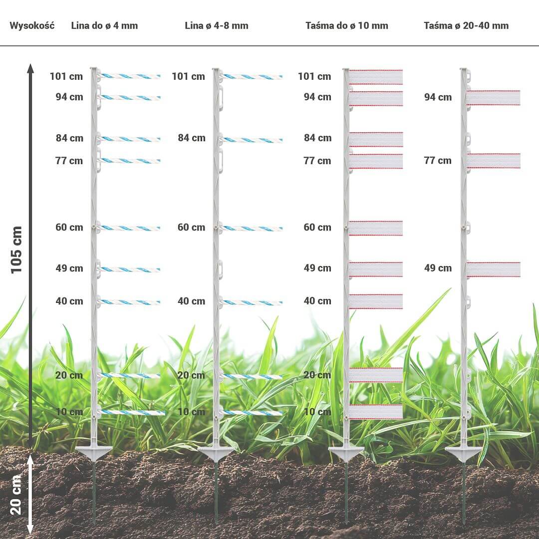 Słupek w kolorze białym jest bardzo uniwersalny i nadaje się do wszystkich rodzajów instalacji ogrodzeń elektrycznych. Służy do ogrodzenia koni i kucyków, osłów, jeleni lub do ochrony przed zwierzyną łowną. Wzmocnienie włóknem szklanym sprawia, że słupek jest bardzo wytrzymały i odporny na łamanie, zginanie i skręcanie. Wysokiej jakości materiał o wysokiej stabilności UV.