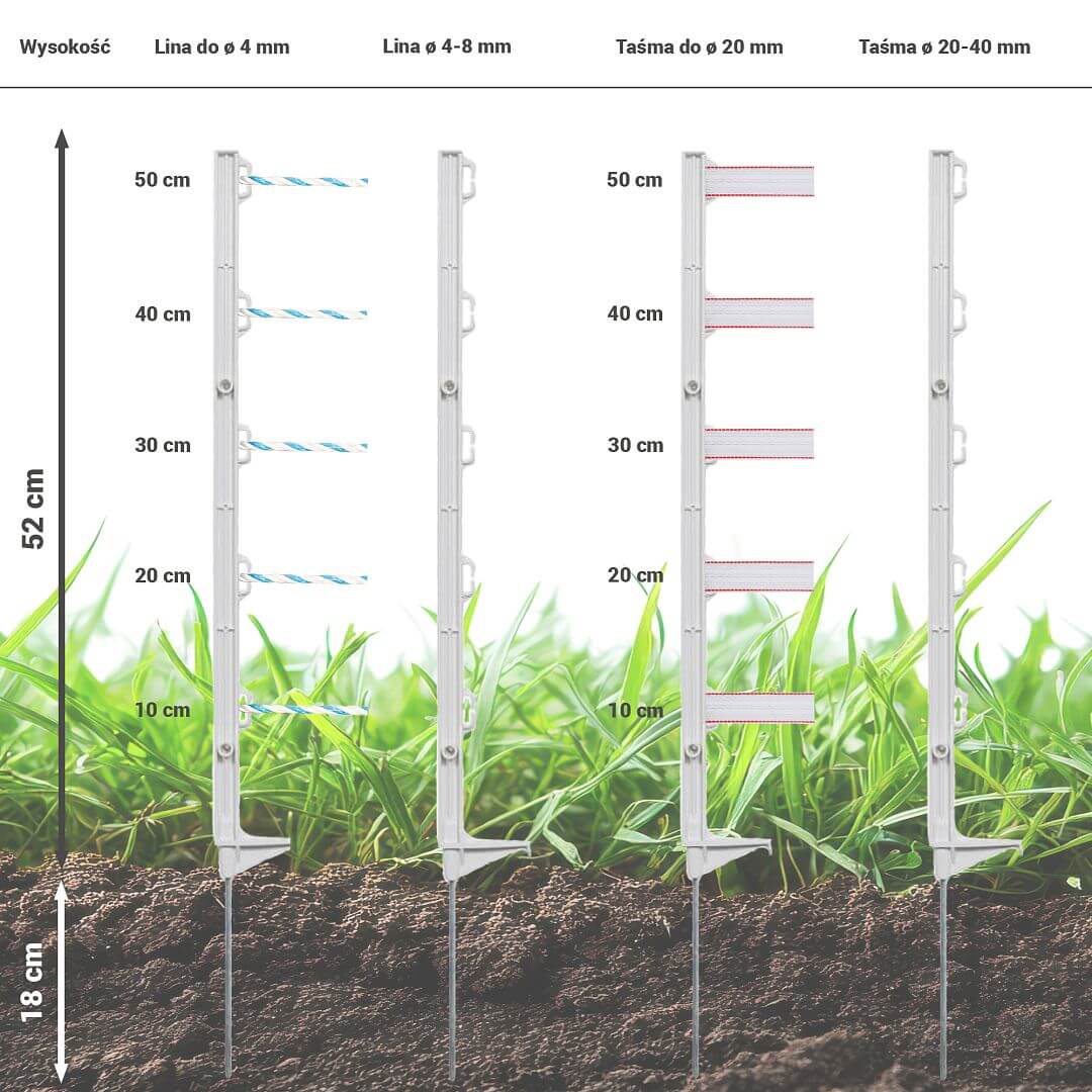 Uniwersalny plastikowy pręt do ogrodzenia elektrycznego w kolorze białym z 5 oczkami do standardowych przewodów ogrodzenia elektrycznego. Słupek nadaje się do wyznaczania tymczasowej i stałej przestrzeni ogrodzenia elektrycznego.