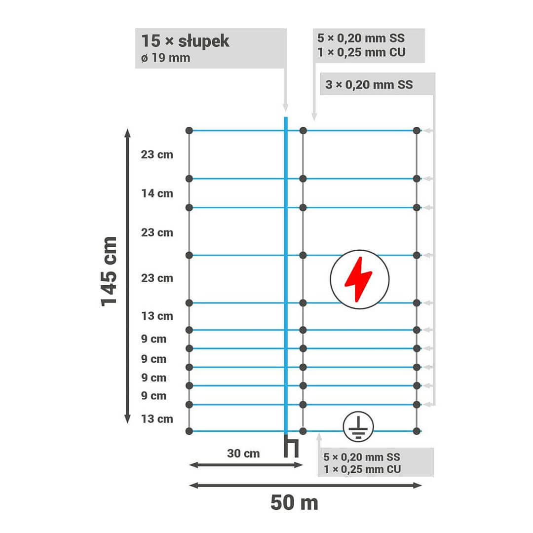 Cechy niebieskiej elektrycznej siatki na wilki o długości 145 cm: