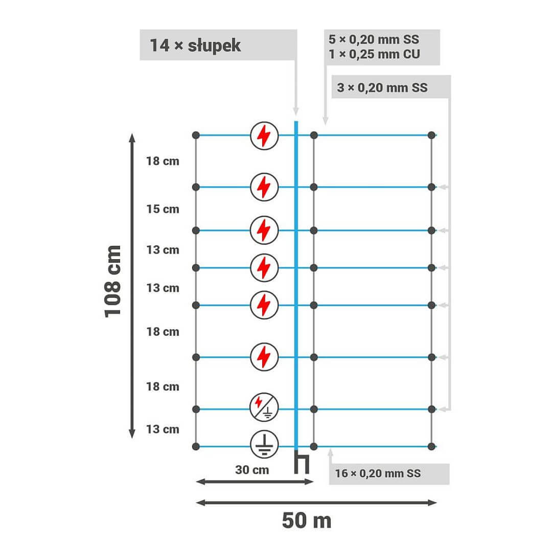 - Dołączany wzmocniony przewód uz iemiający dla dodatkowego uziemienia na całej długości siatki w trudnych warunkach glebowych