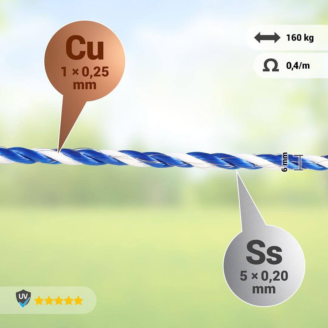 Cechy produktu Zestaw z liną ogrodzeniową 6 mm 0,4 Ω/m + podwójne złącza + znaki ostrzegawcze