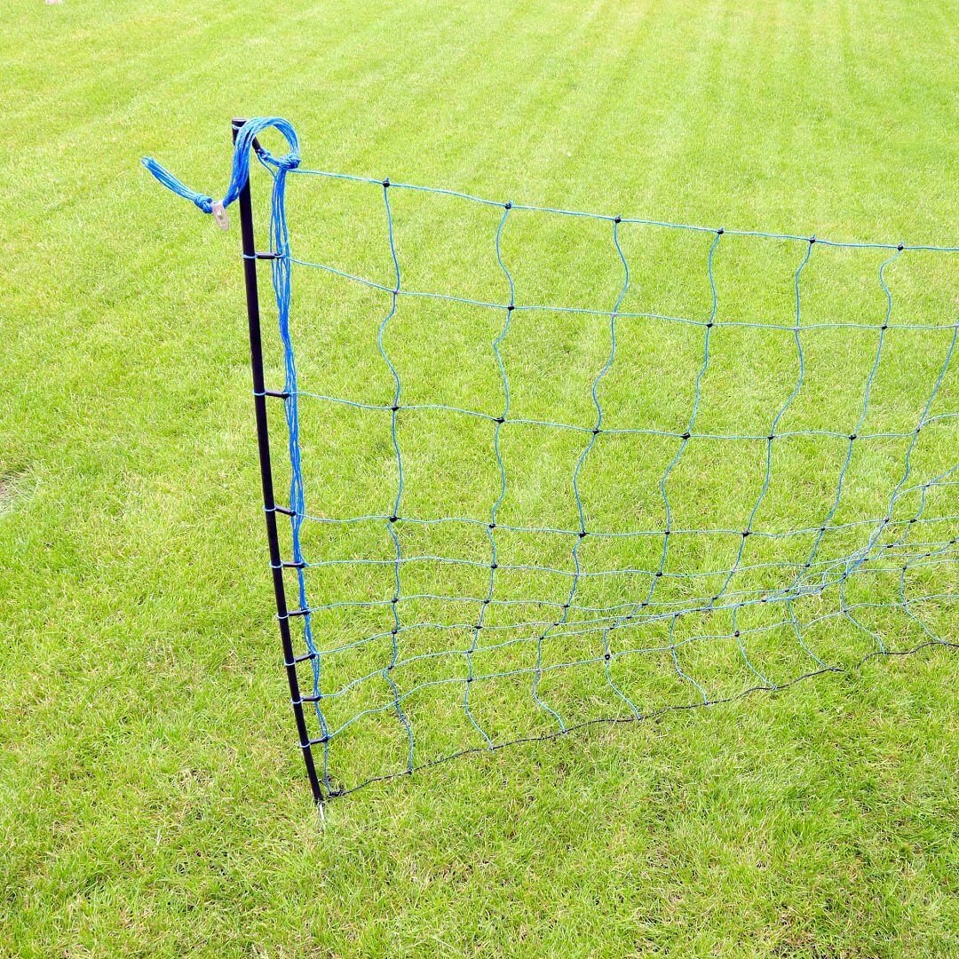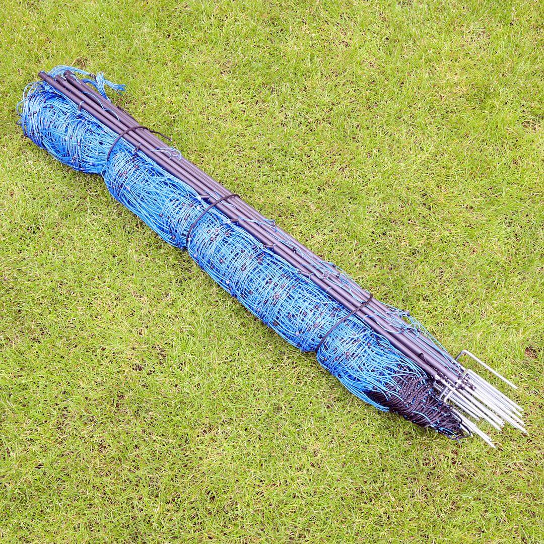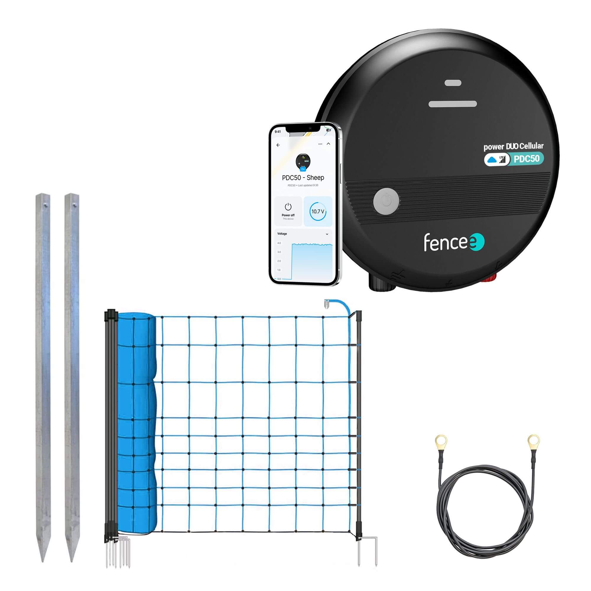 Kompletny zestaw ogrodzenia elektrycznego z niebieską siatką dla hodowców owiec i jagniąt. Zapobiegaj stratom i ochroń swoje zwierzęta przed atakiem wilków dzięki temu kompletnemu zestawowi z inteligentnym źródłem LTE i elektryczną siatką na wilki.