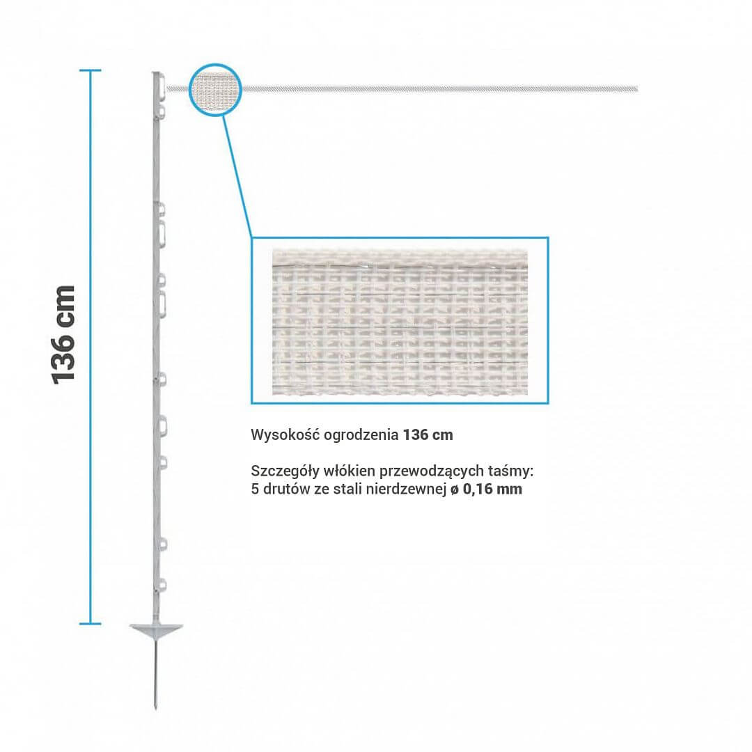 Wysokiej jakości biała taśma w rolce o długości 200 m z 5 przewodnikami ze stali nierdzewnej zapewnia dobrą przewodność na całej długości ogrodzenia. Taśma jest bezpieczną opcją przy budowie ogrodzeń dla koni, kucyków i osłów. Nie są one narażone na obrażenia w przypadku zderzenia z przewodnikiem. Plastikowe słupki ruchome z 8 oczkami i solidnym metalowym szpikulcem umożliwiają instalację przewodnika do 86 cm nad ziemią.