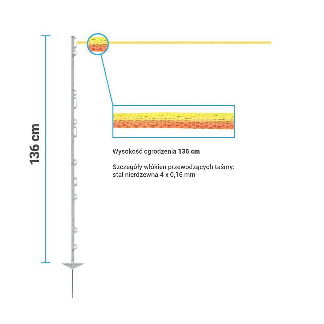 Pomarańczowa taśma o średnicy 10 mm z czterema drutami ze stali nierdzewnej do wyznaczania obszaru o obwodzie do 250 m zapewnia wysokiej jakości długotrwałe ogrodzenie. Jej pomarańczowy kolor jest dobrze widoczny. Dzięki ruchomym słupkom z tworzywa sztucznego ze wzmocnionym profilem i mocnym szpikulcem można stworzyć ogrodzenie o wysokości do 136 cm nad ziemią.